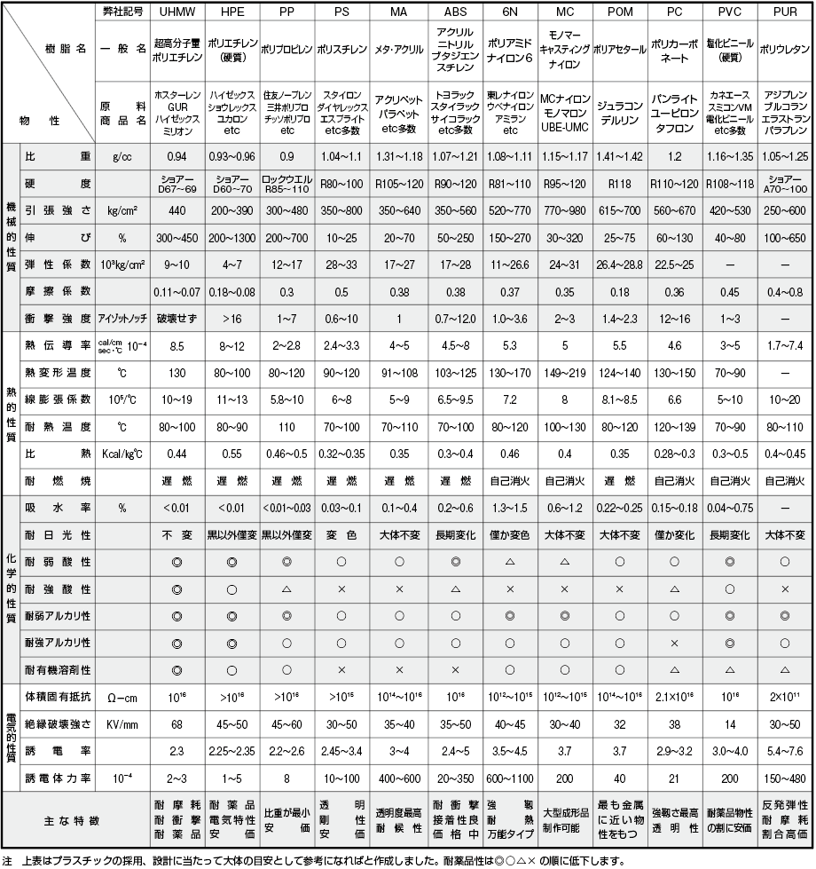 MCナイロン、UHMW(超高分子量PE)、POM(ジュラコン)、PE、PP、ARS、